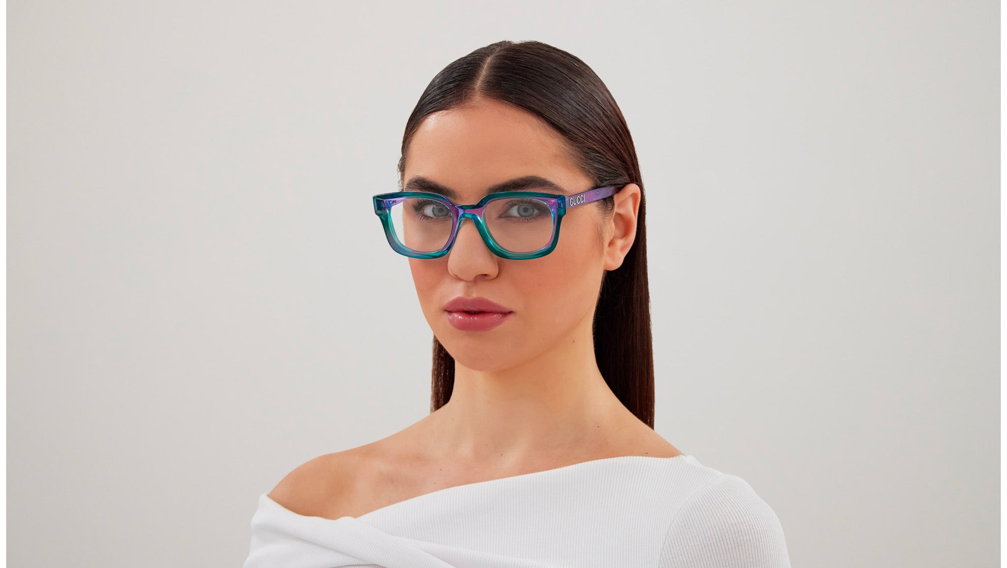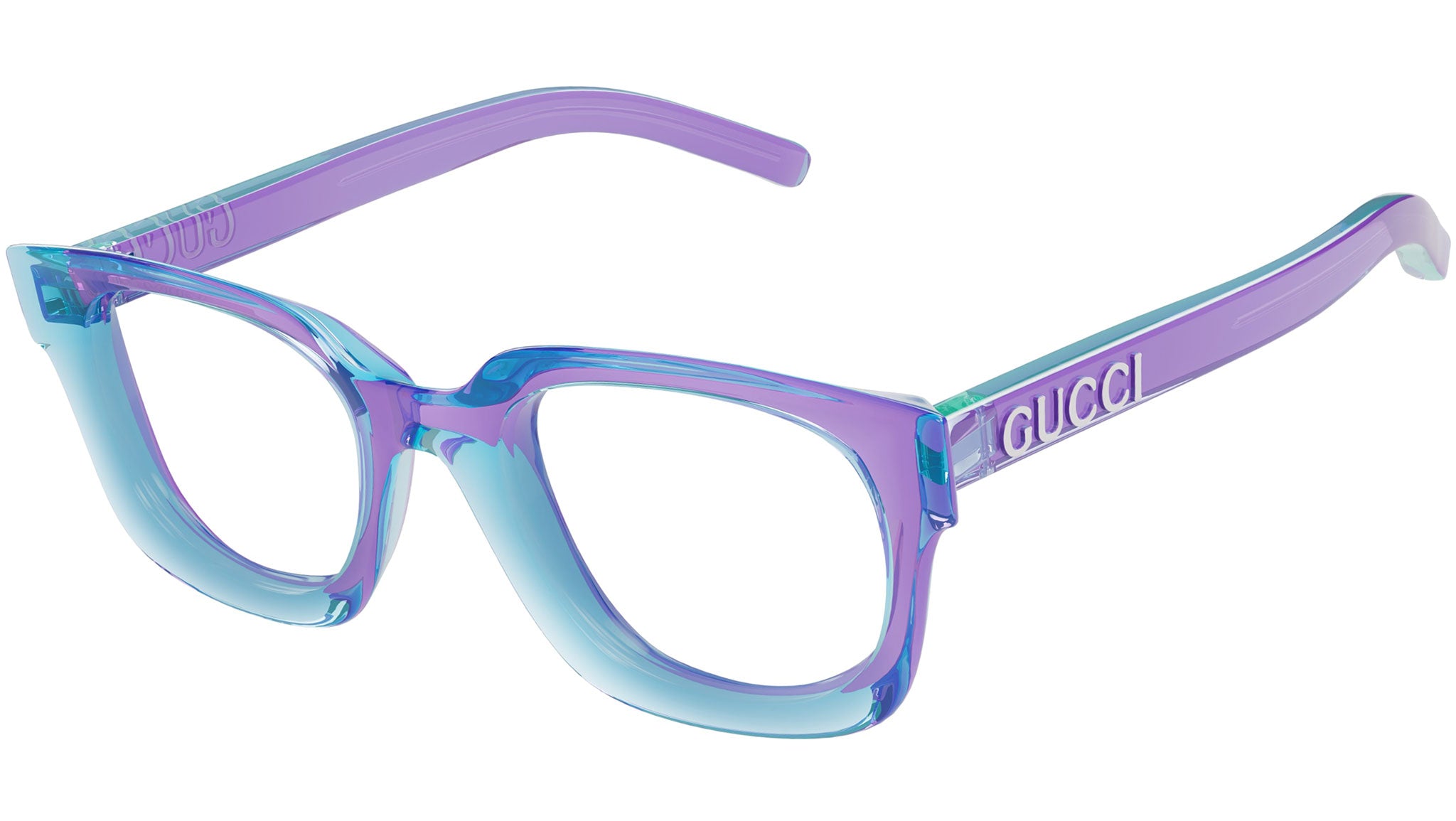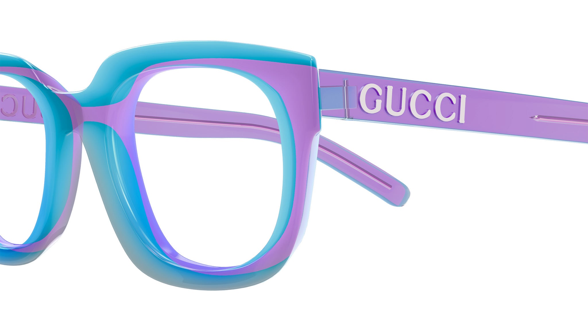 Occhiali da vista Gucci modello GG1721O linea Lettering in iniettato forma rettangolare codice colore 003 viola trasparente lucido - bordo anteriore allover: tiffany trasparente lucido con aste in viola e lenti demo. Rivenditore autorizzato Gucci online. Gli occhiali vengono consegnati con custodia e accessori originali e sono coperti dalla garanzia ufficiale di 12 mesi del produttore.