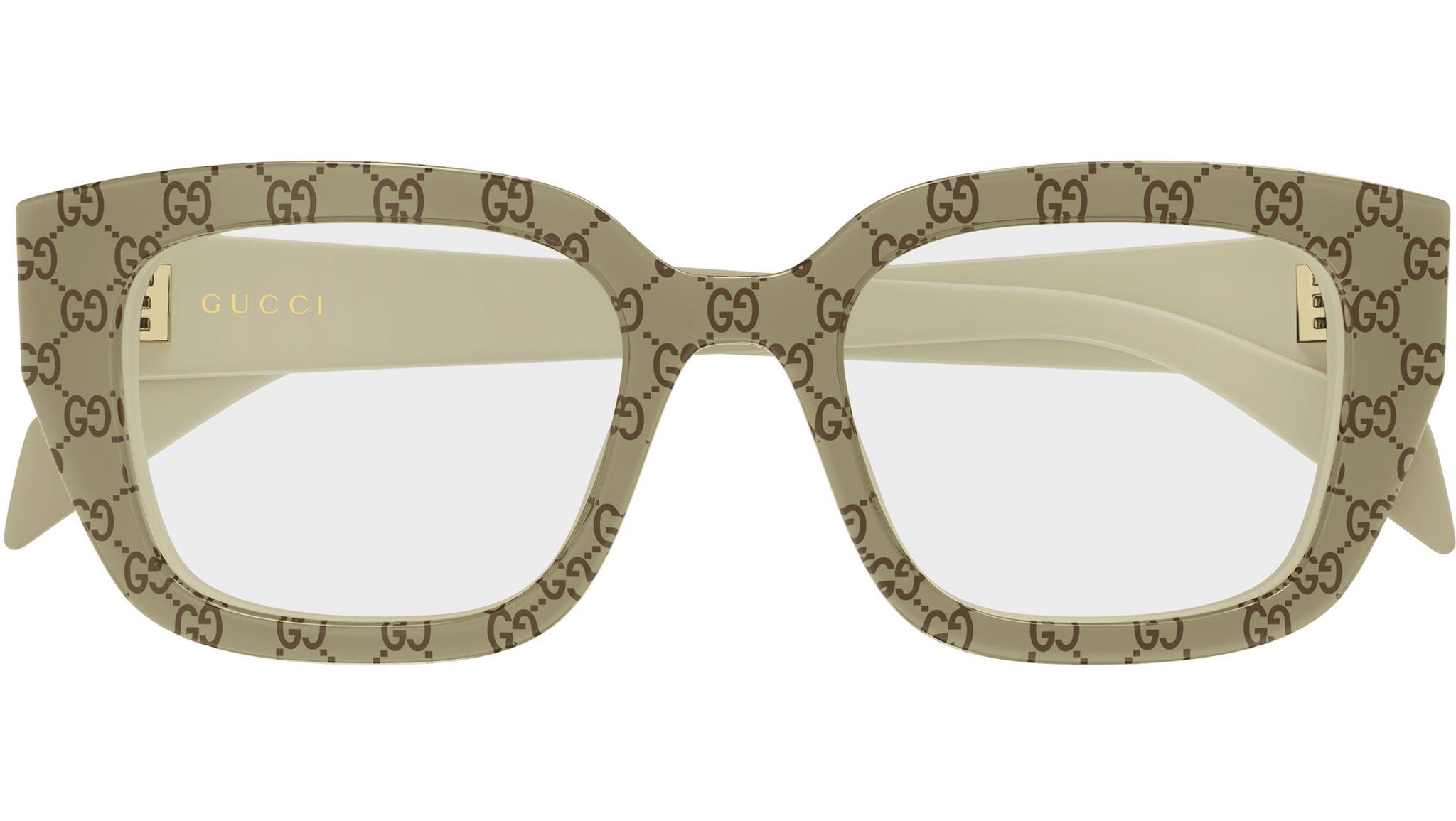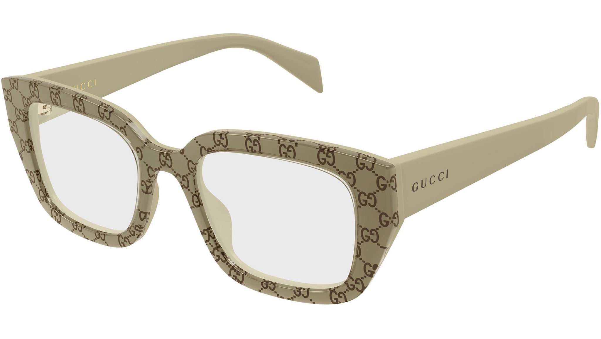 - Colore montatura beige trasparente lucido trilayer + monogram GG madreperla + beige solido