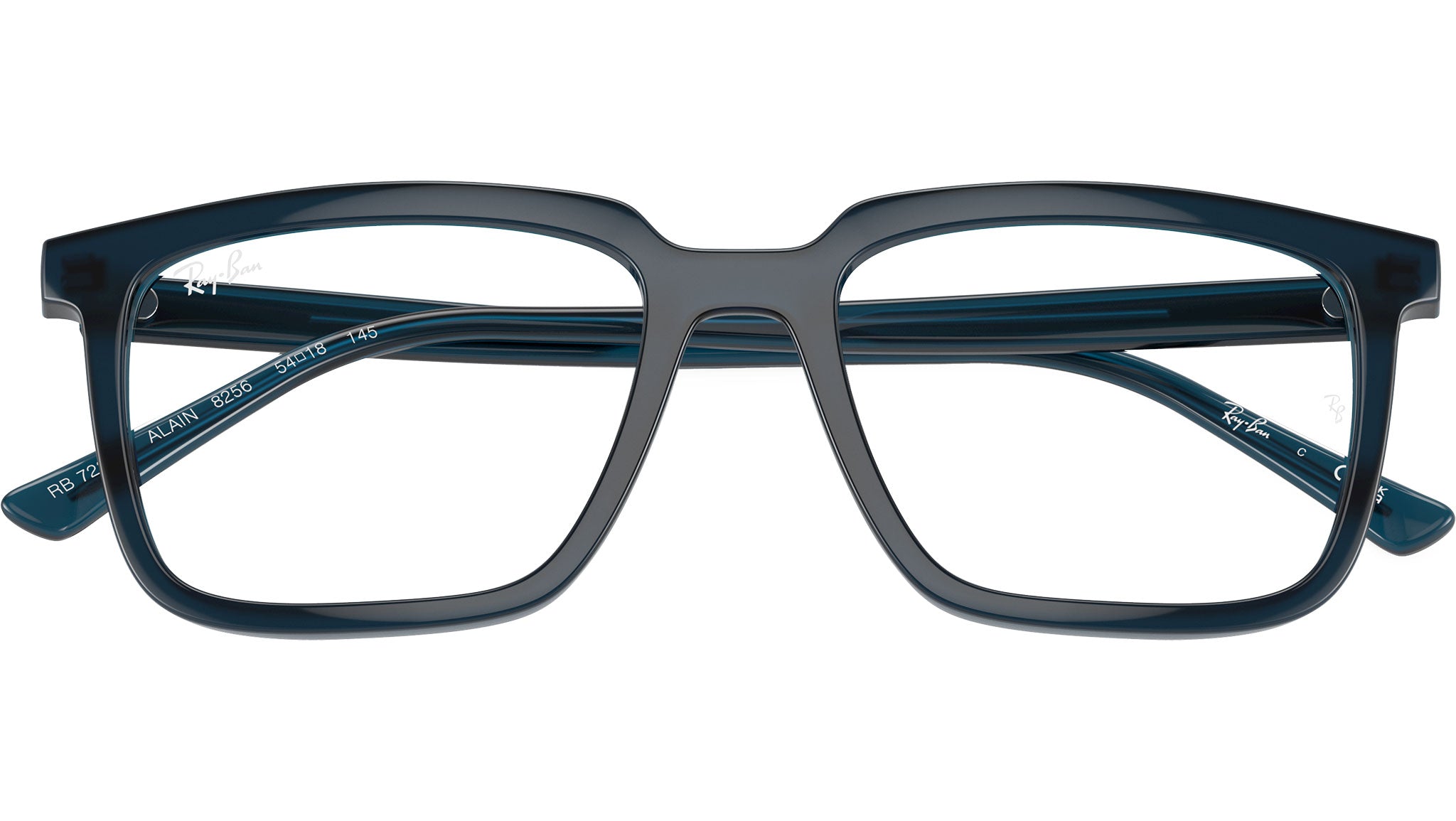 Occhiali da vista Ray-Ban Alain RB7239 8256 unisex con montatura rettangolare in propionato blu scuro opalino e lenti demo. Vestibilità a ponte alto. Linea: Essentials. Codice modello: 0RX7239. Codice colore: 8256. Rivenditore autorizzato Ray-Ban online. Gli occhiali vengono consegnati con custodia e accessori originali e sono coperti dalla garanzia ufficiale di 12 mesi del produttore.