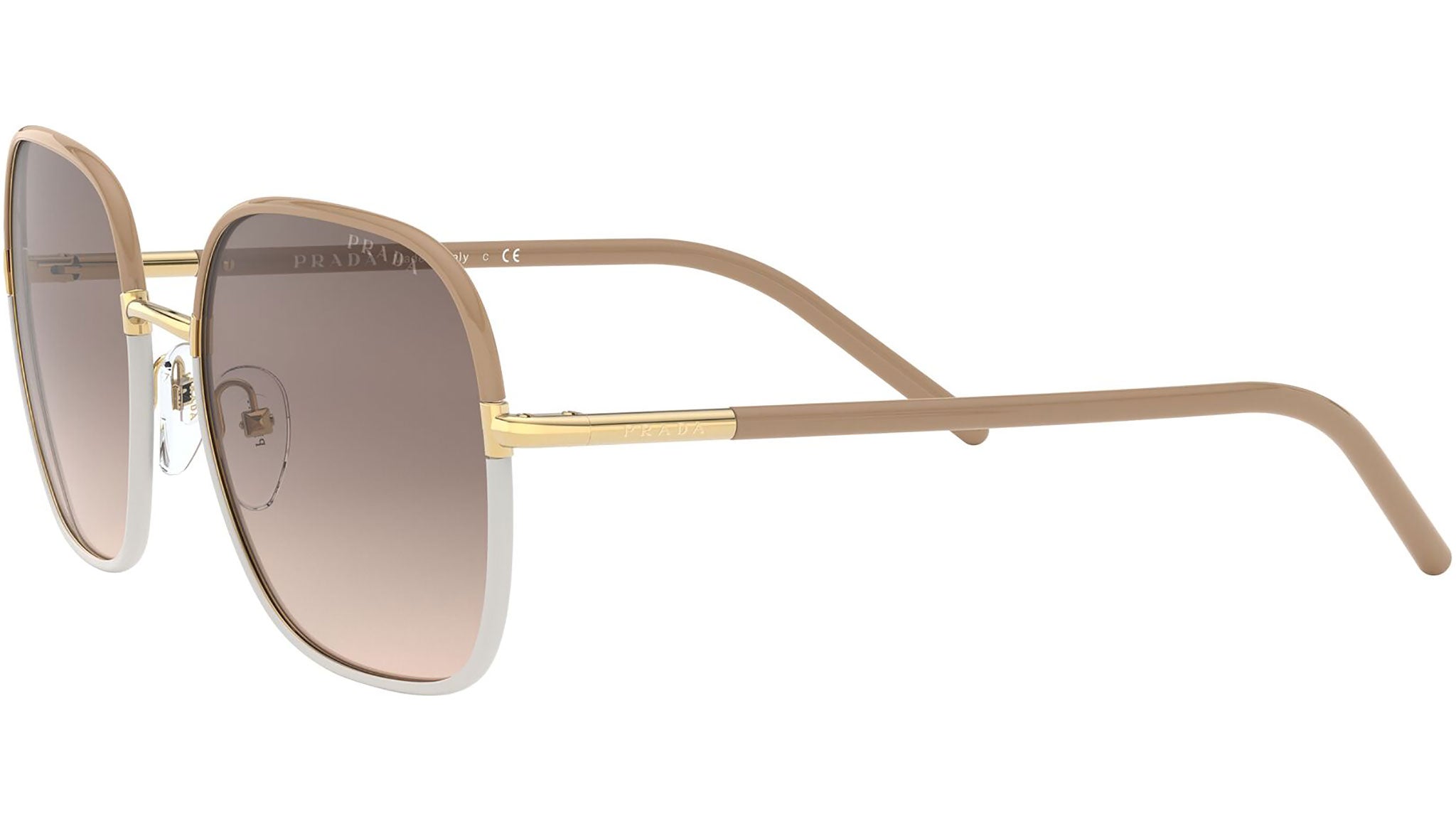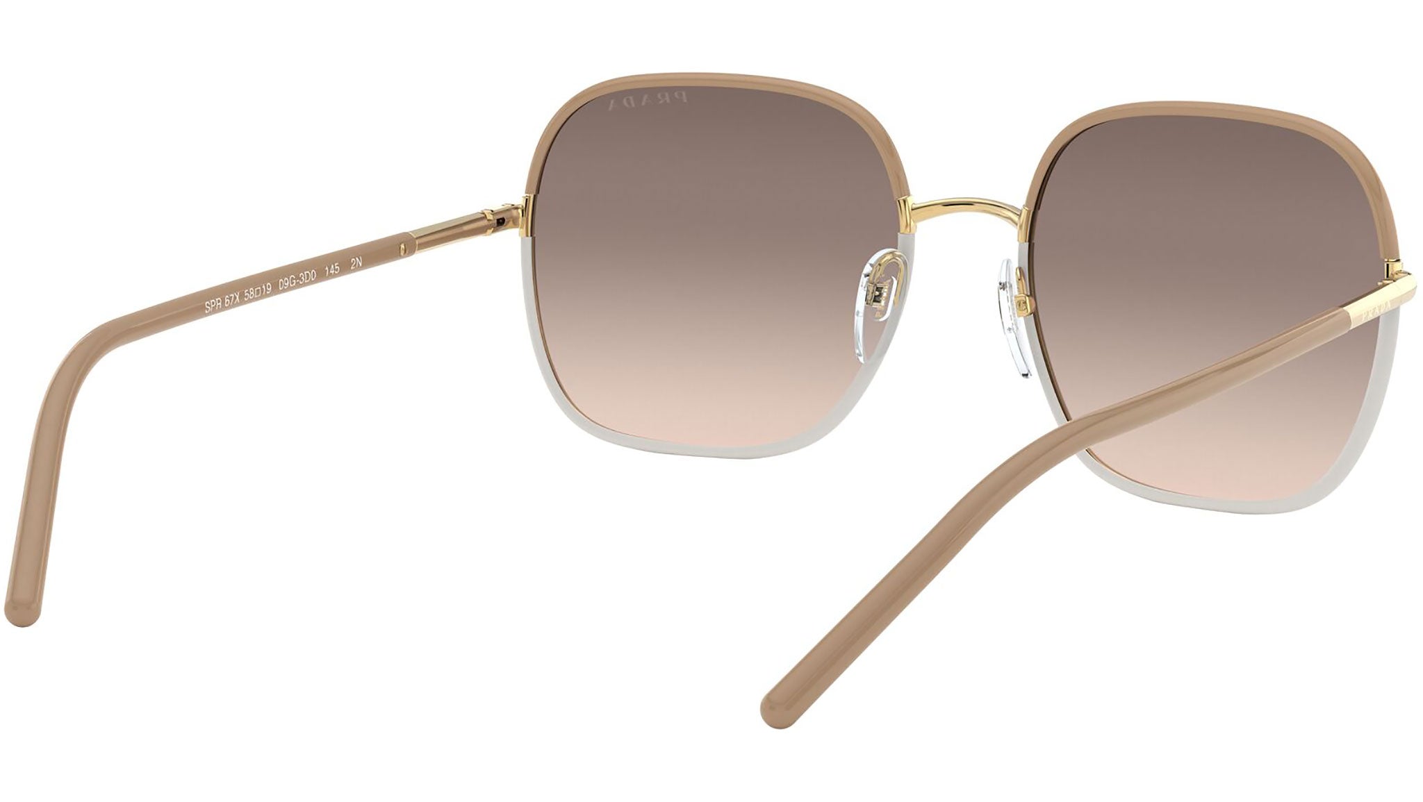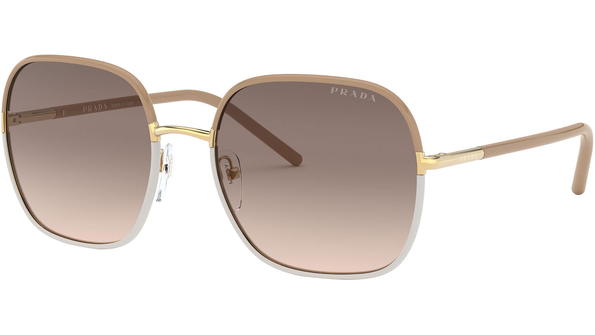 Prada sunglasses model PR 67XS, beige and white frame variant, color code 09G3D0 with light brown gradient light grey lens. Prada represents the best of Italian culture and tradition. It is one of the most innovative, prestigious and widely recognized brands in the fashion and luxury goods industries, with a keen attention to details and new trends.