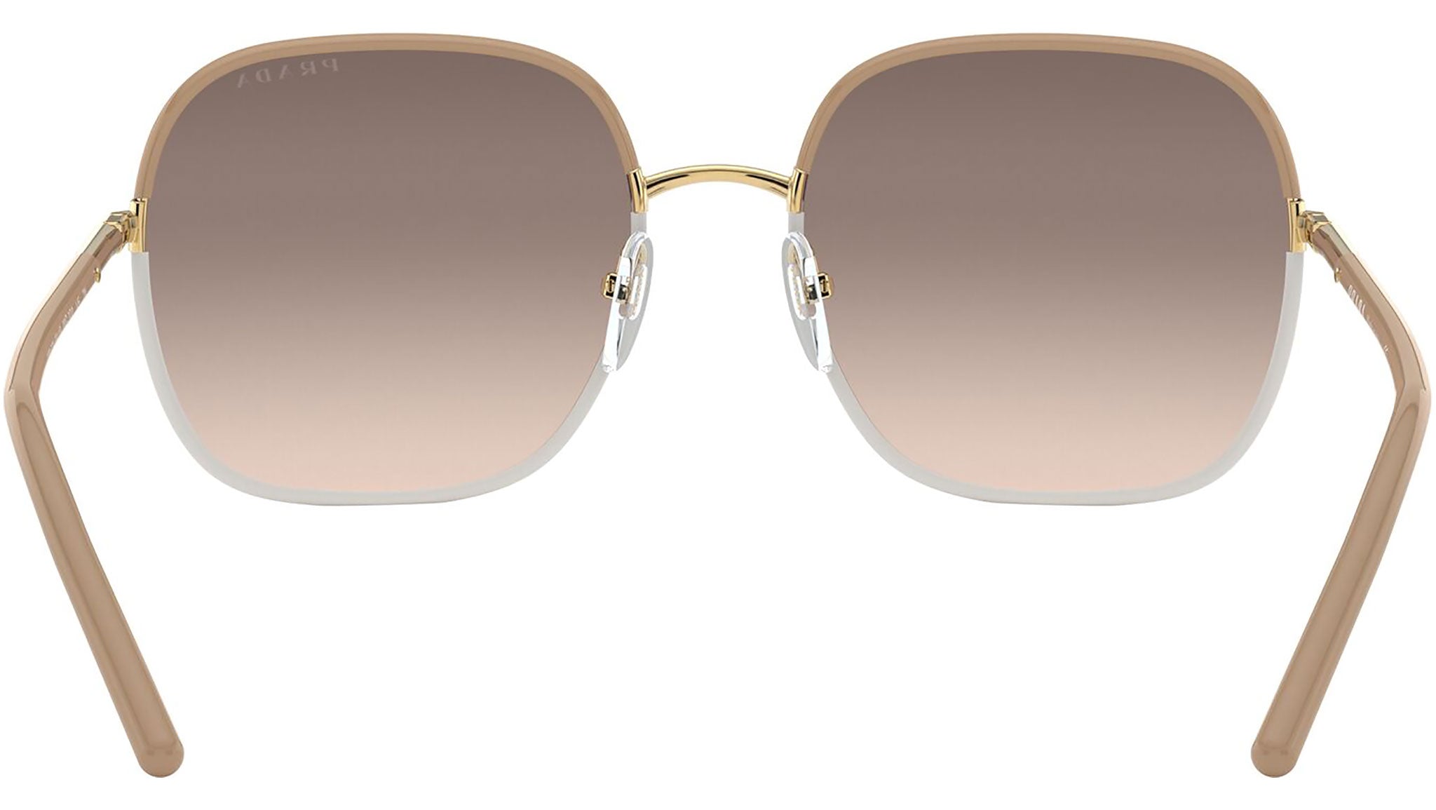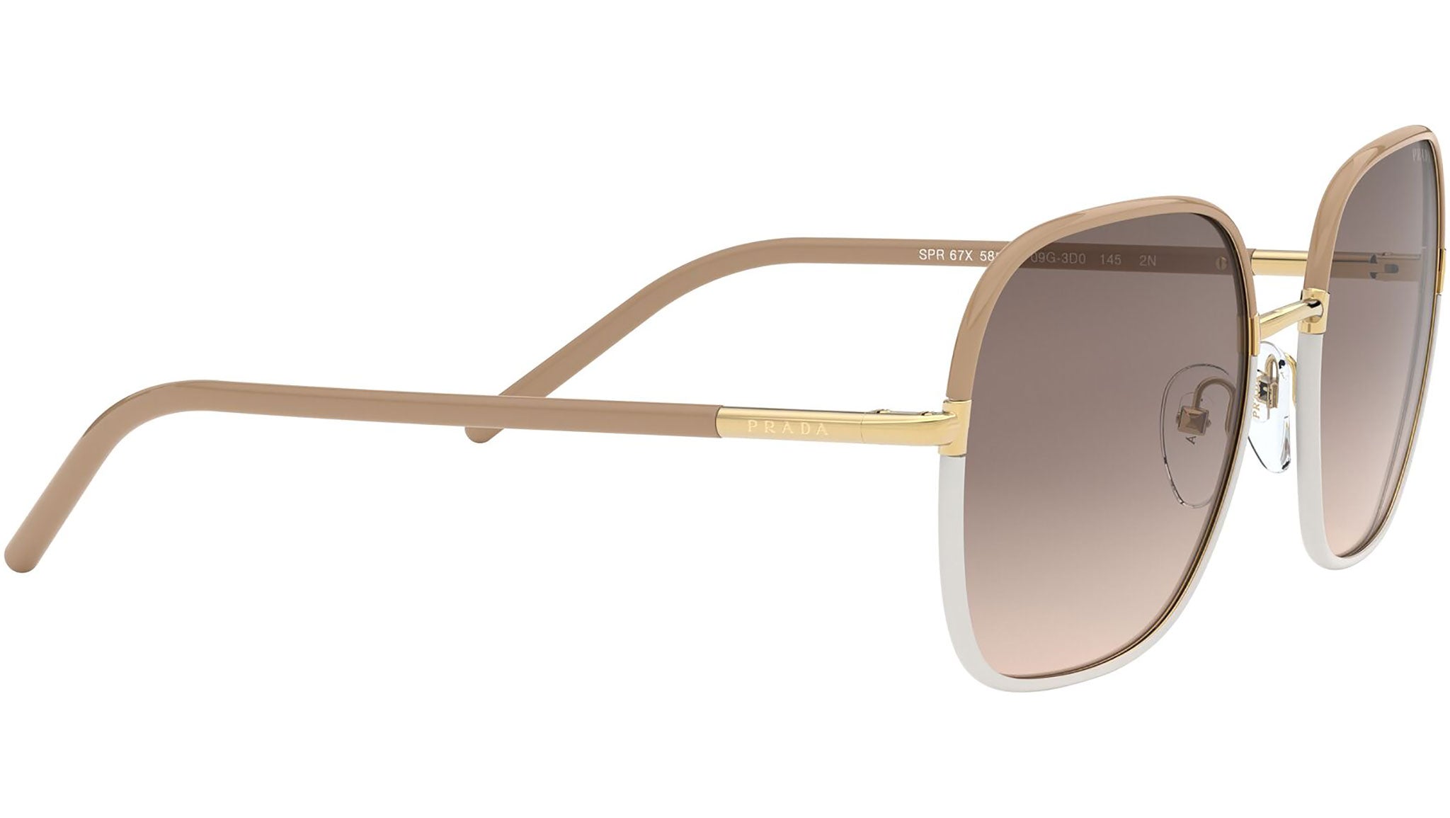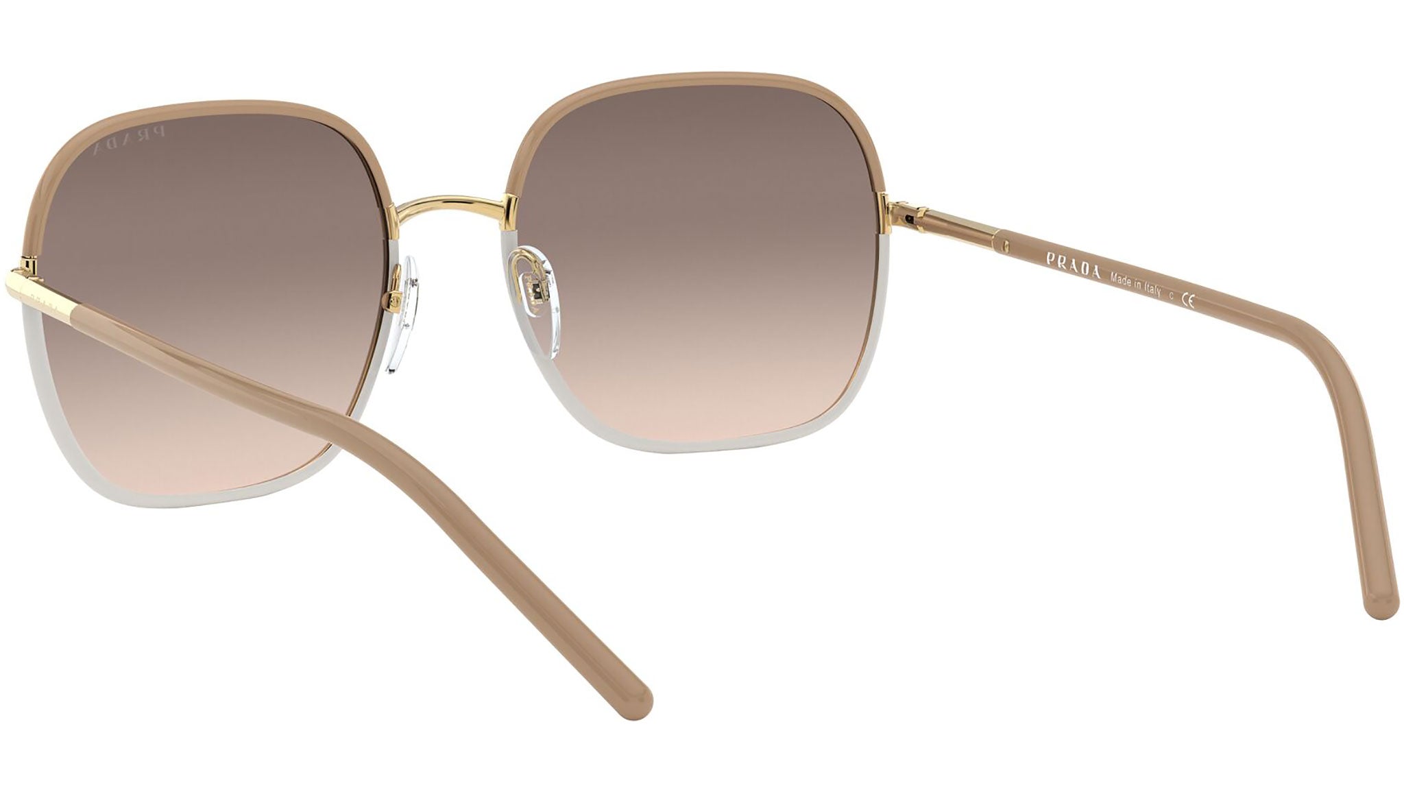 Prada sunglasses model PR 67XS, beige and white frame variant, color code 09G3D0 with light brown gradient light grey lens. Prada represents the best of Italian culture and tradition. It is one of the most innovative, prestigious and widely recognized brands in the fashion and luxury goods industries, with a keen attention to details and new trends.