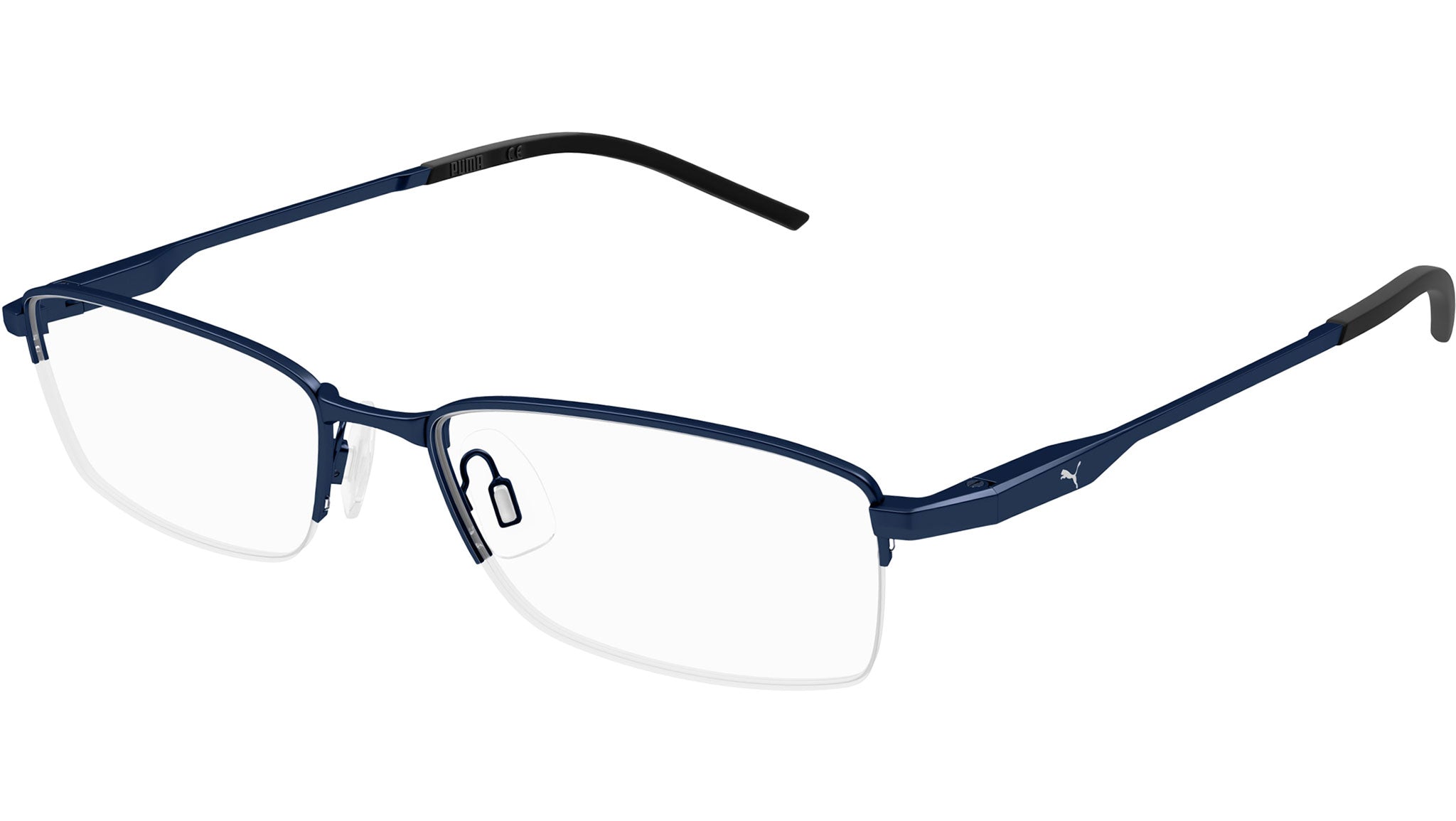 Occhiali da vista Puma Tech modello PU0448O variante colore 003 blu verniciato semiopaco trasparente con lenti demo. Rivenditore autorizzato Puma online. Gli occhiali vengono consegnati con custodia e accessori originali e sono coperti dalla garanzia ufficiale di 12 mesi del produttore.