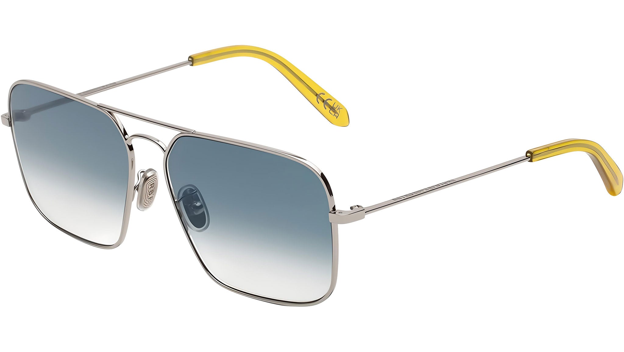 Iggy is a fresh boxy spin-off from the classic shaped aviator frames. The sturdy metal frame is characterized by a clean and essential structure, double metal bridge and wide rectangular lenses. This version of the model features elegant and classic finish with silver metal galvanic and playful blue faded lenses juxtaposed with soft crystal mustard acetate on the temple tips. Sizes: R. Lens Width: 58 mm. Frame Front: 0 mm. Frame Side: 140 mm. Product Code Size R: MD3.
