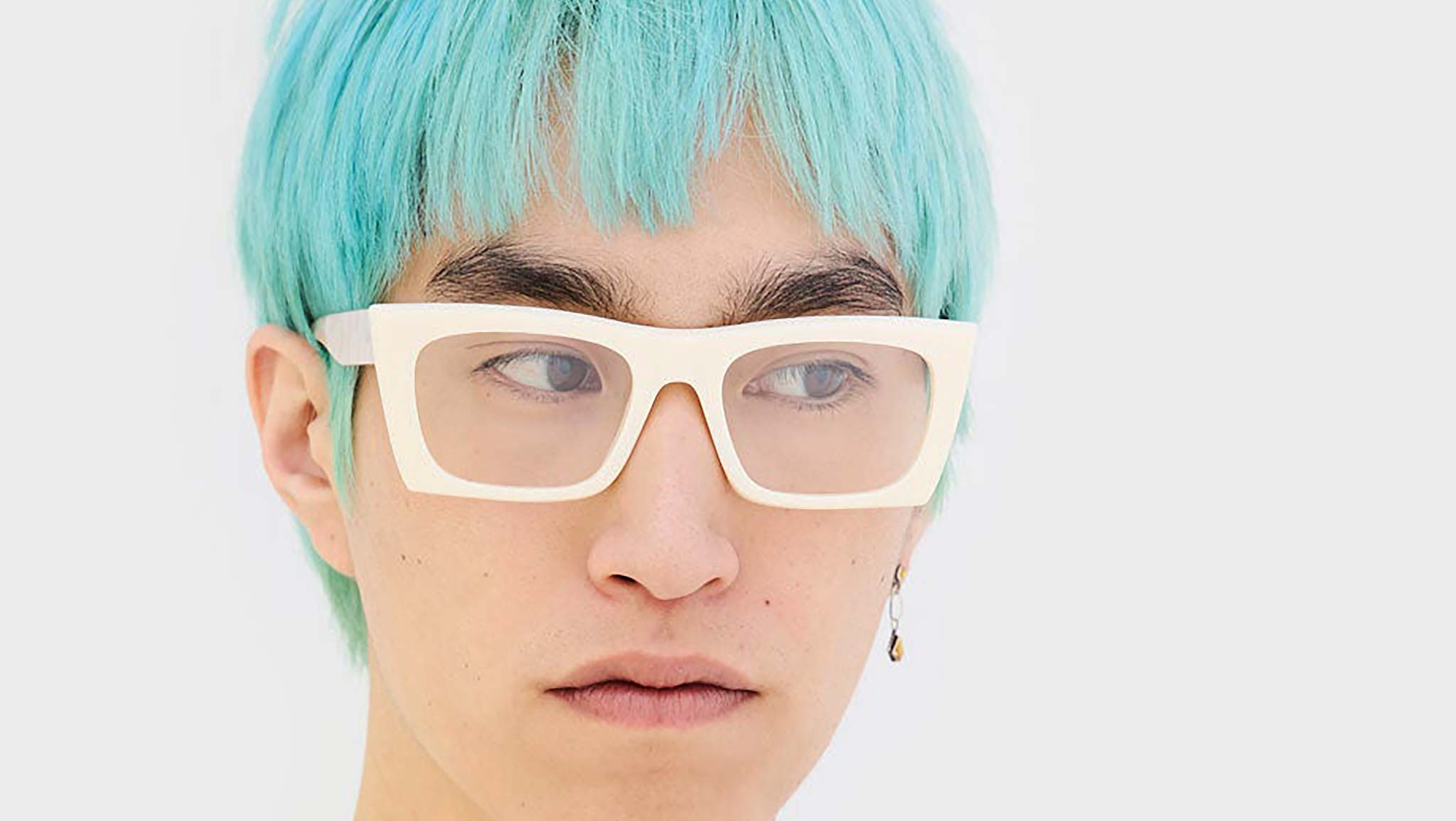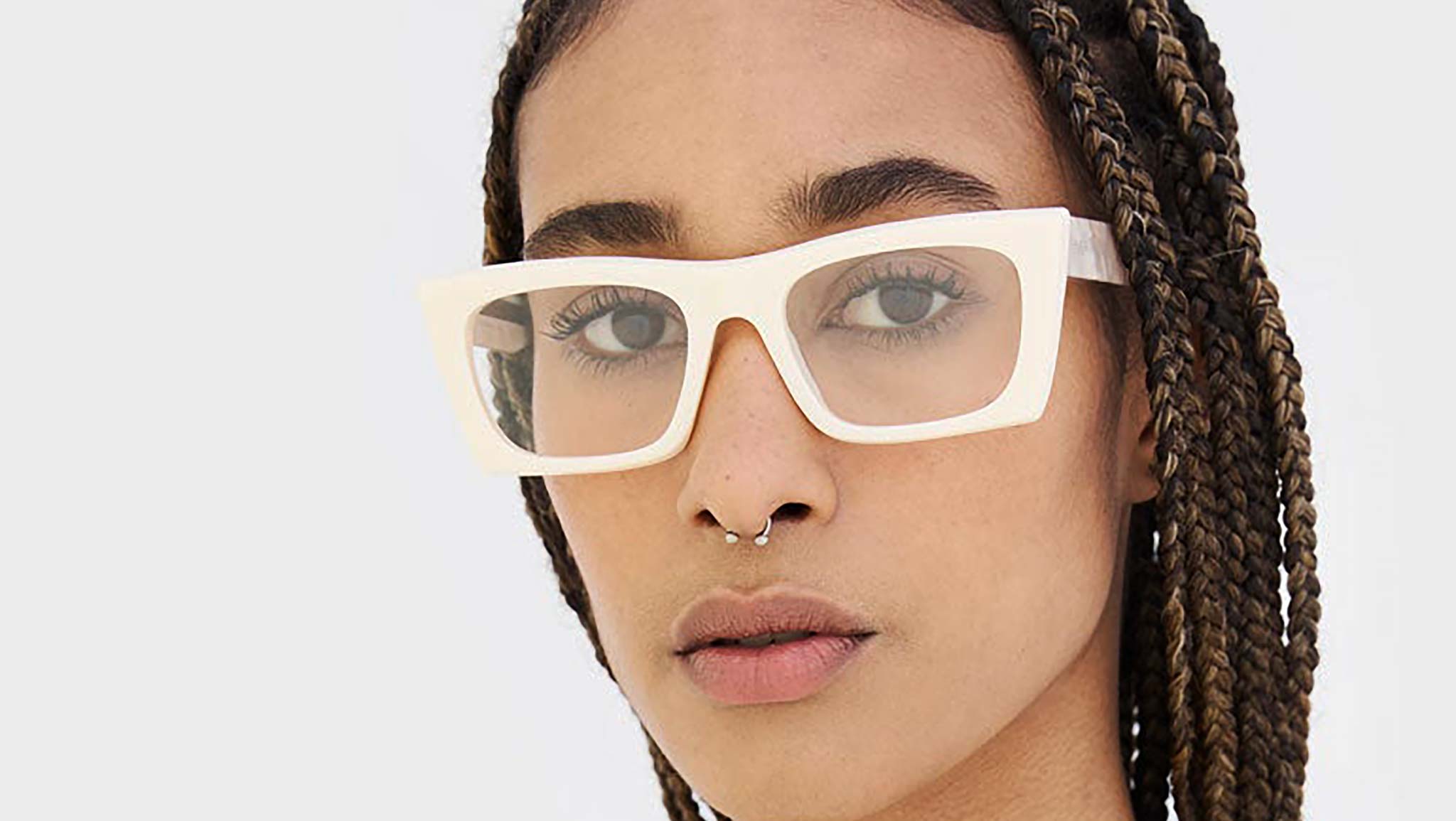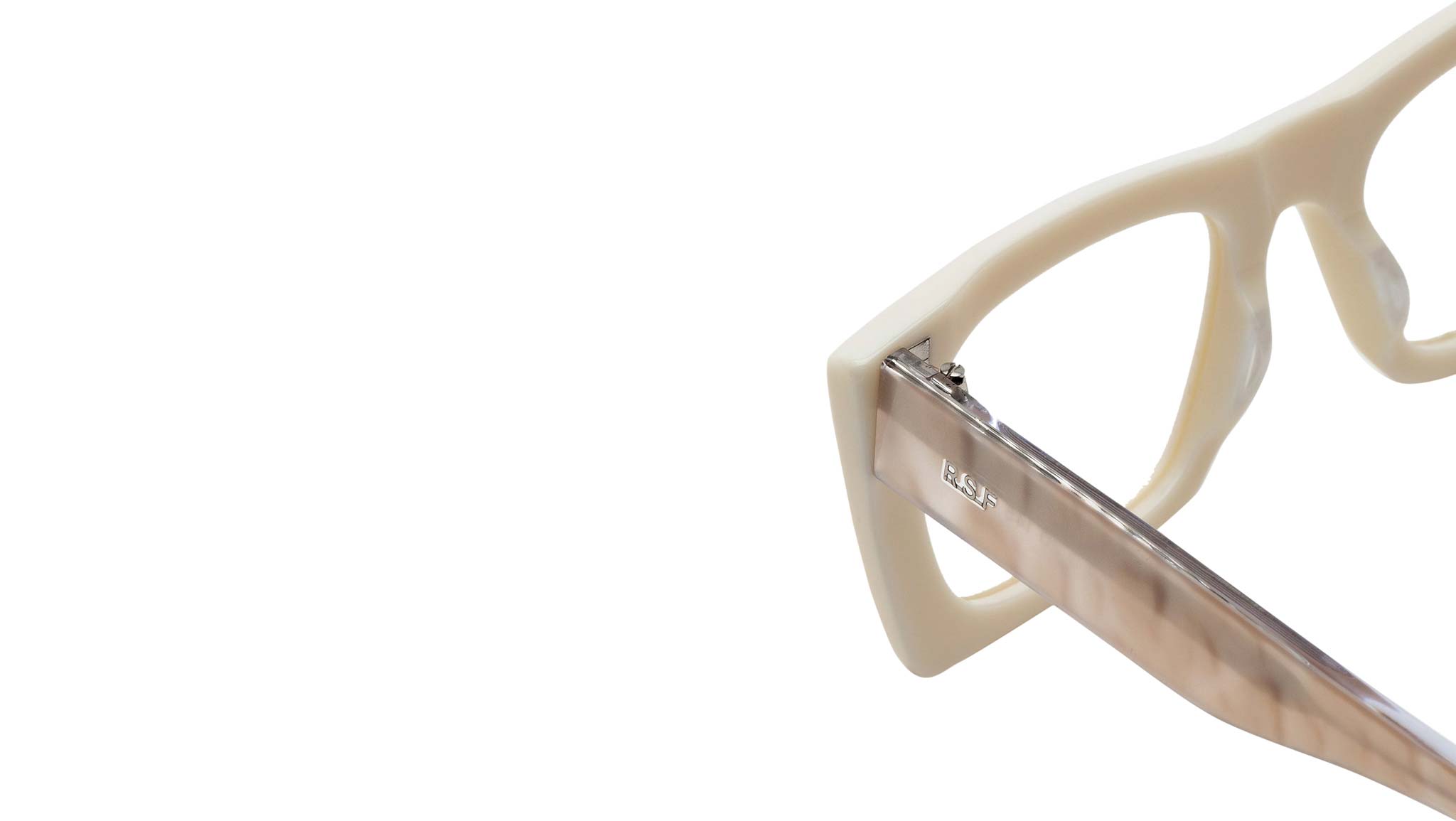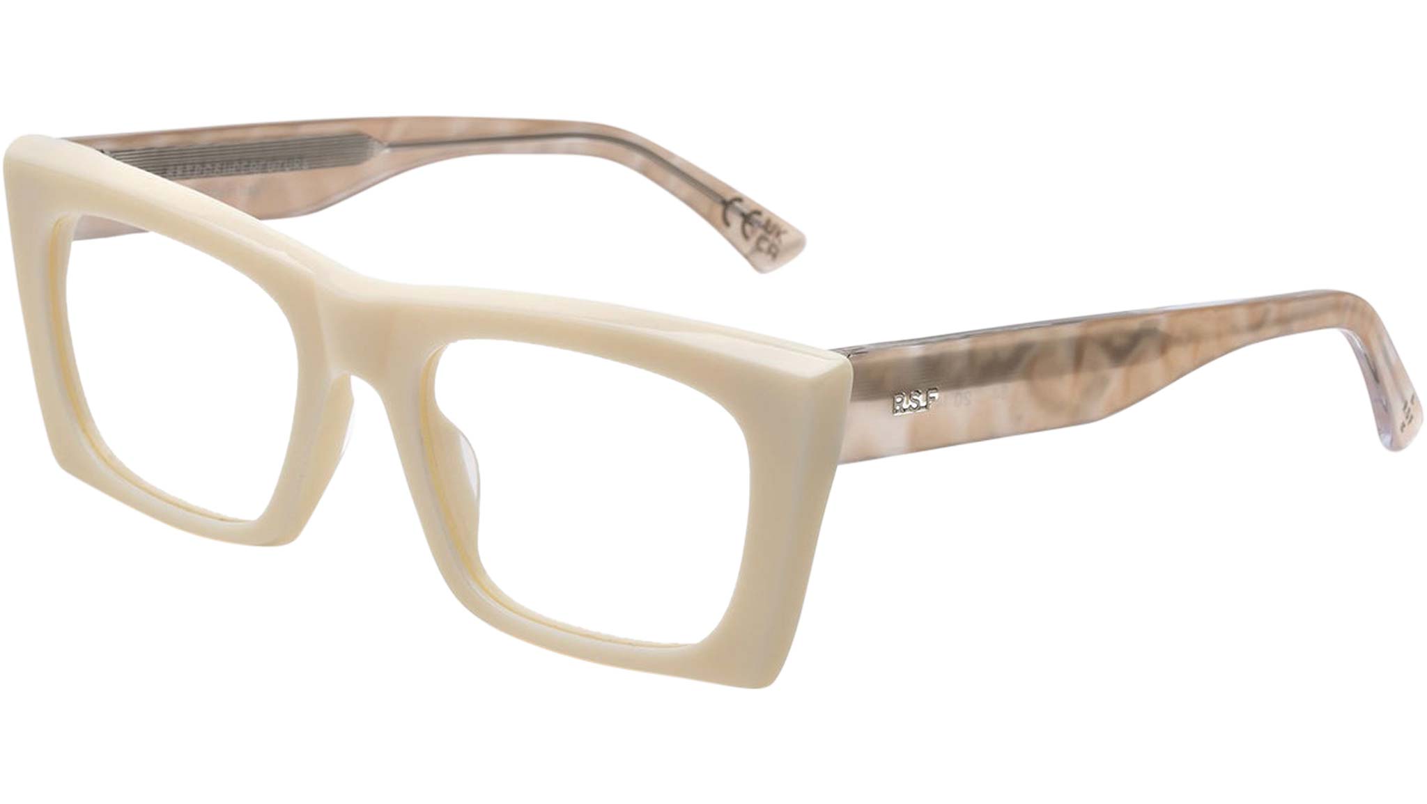 Numero 117 by Retrosuperfuture is an everyday piece of eyewear with character. The model features a sharp, angular profile, with pointy detailing on the temples giving it the characteristic stand-out look it has. A compact, sturdy design, Numero 117 is an elegant yet playful silhouette with a street edge. This model comes in a pearly white acetate that softens its sharp features. Sizes: R Lens Width: 54 mm. Frame Front: Frame Side: 145 mm. Product Code Size R: Z0O