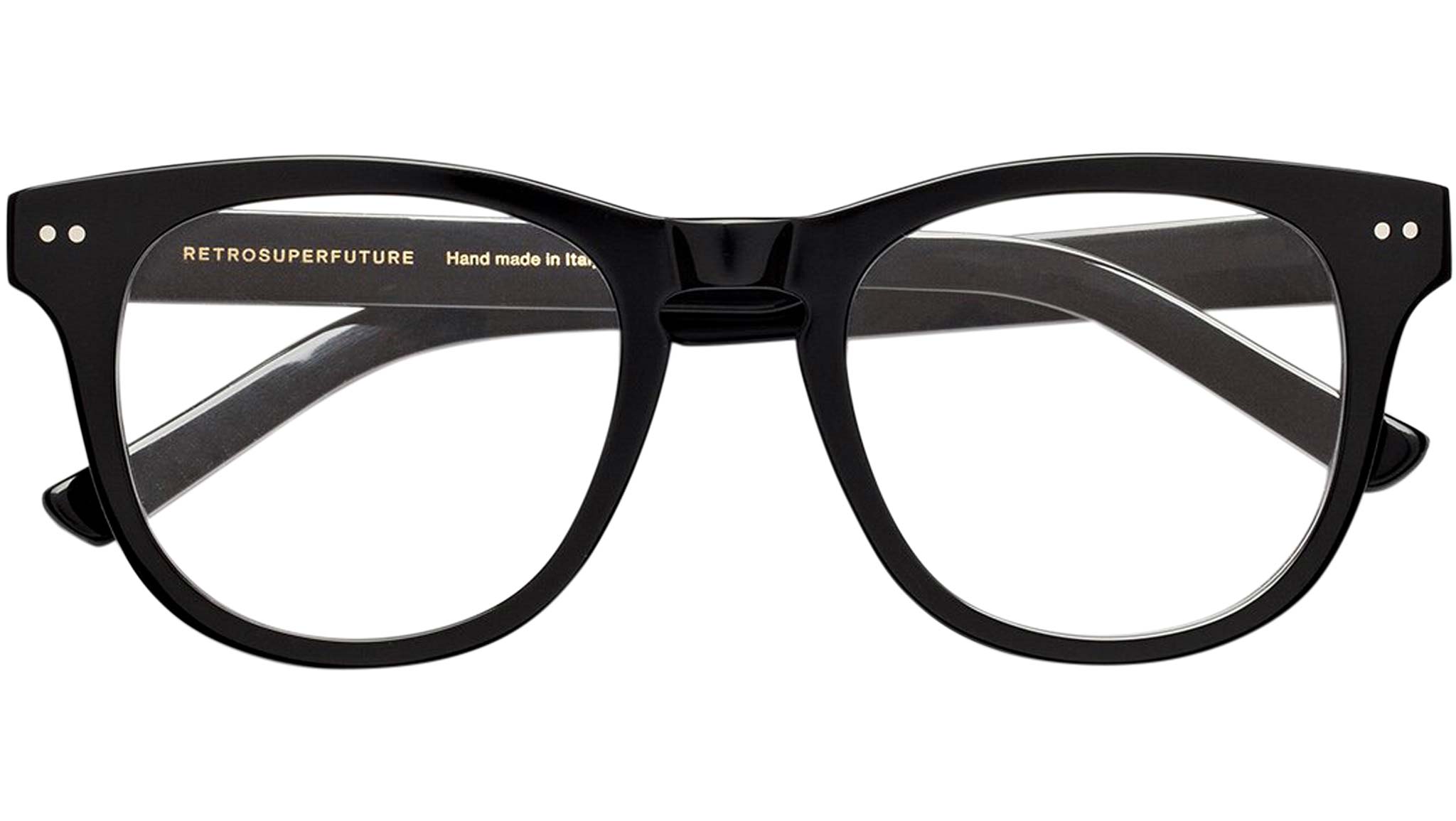 Numero 81 by Retrosuperfuture is a statement piece of eyewear. Precise curves and functional details define this bold frame, with thick rims, a curved upper line and keyhole nose-bridge shaped for daily use. This model comes with a black acetate. Prescription lenses not included. The box contains a hard case and a cleaning cloth.