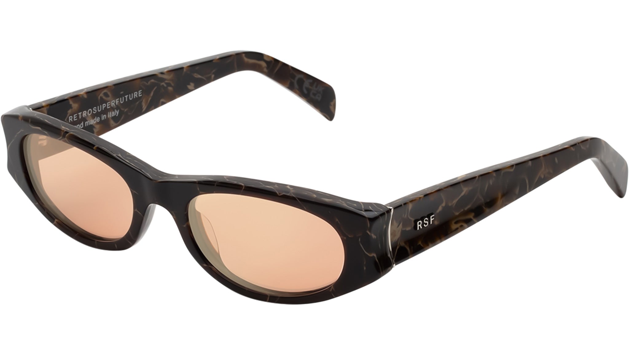 Razzo rides fast. Its unique low-set design unites the Y2K fashion aesthetics to the cross-over sports culture infused frames. Its unique temple design extends on to the sides for a one of a kind thermoformed acetate temples, underlining its craftsmanship as well as distinctive and fast paced character. For this version of the Razzo, an exceptional pattern acetate is paired with characteristic pink lenses. Handcrafted in Italy. Sizes: R. Lens Width: 54 mm. Frame Front: Frame Side: 145 mm. Product Code Size R: LS3.