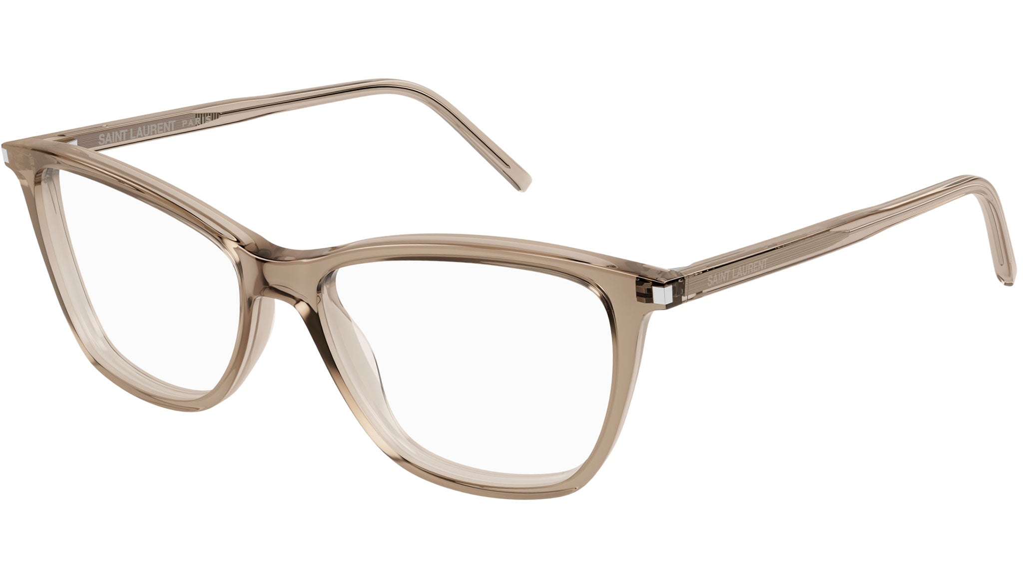 Occhiali da vista Saint Laurent modello SL 259 linea Classic codice colore 014 marrone chiaro trasparente lucido in acetato forma cat eye con aste color marrone.