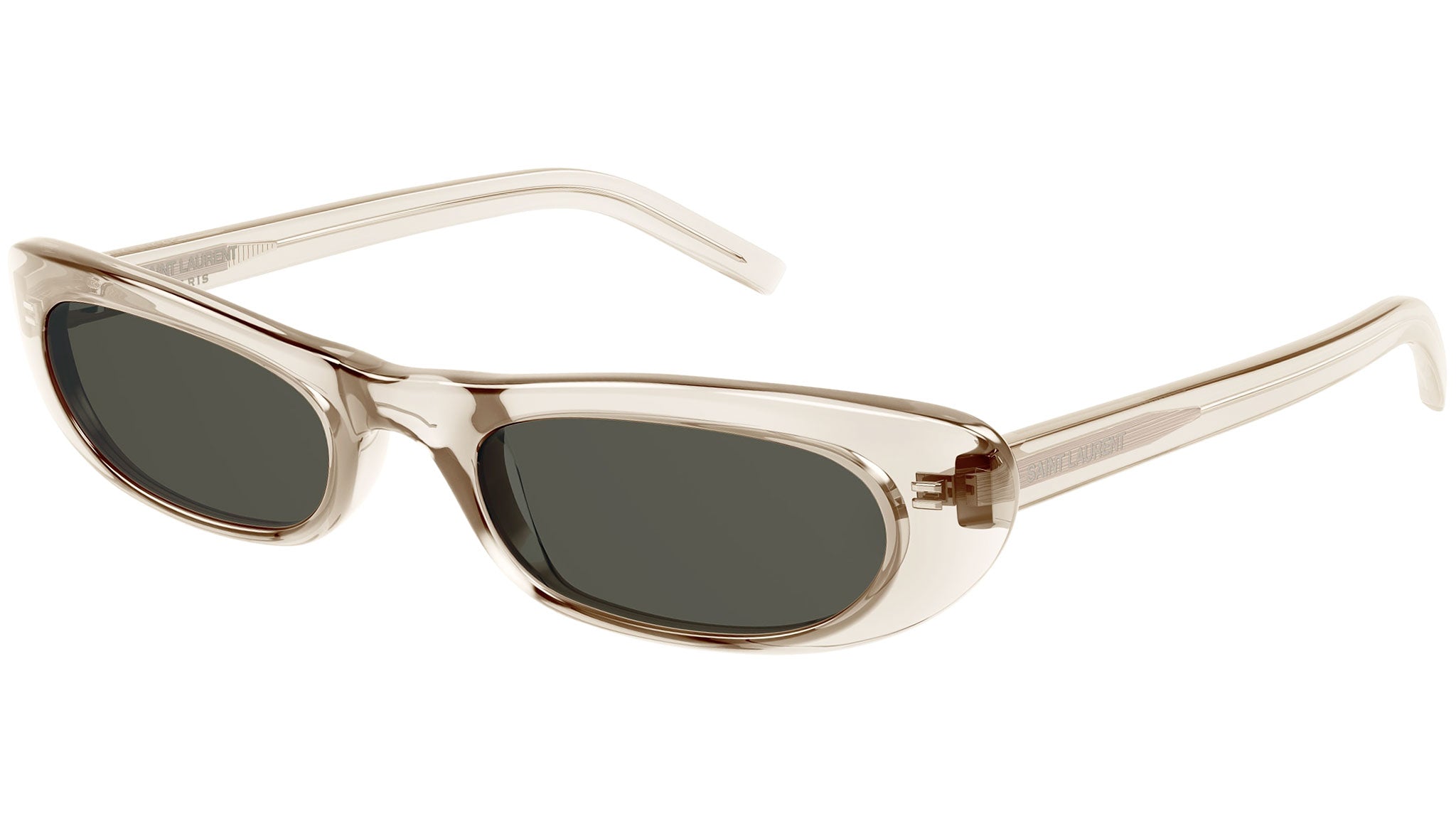 Occhiali da sole Saint Laurent linea New Wave modello SL 557 SHADE variante colore 004 nude trasparente lucido con lenti color grigio tinta unita.