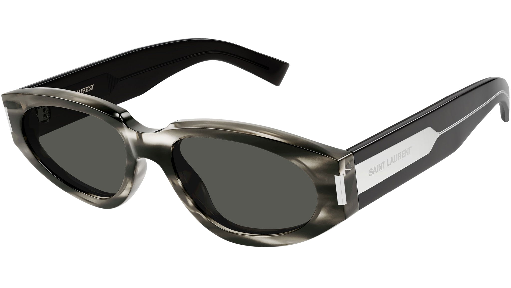 Occhiali da sole Saint Laurent modello SL 618 linea New Wave codice colore 004 grigio striato lucido in acetato riciclato forma panthos con lenti color grigio tinta unita.