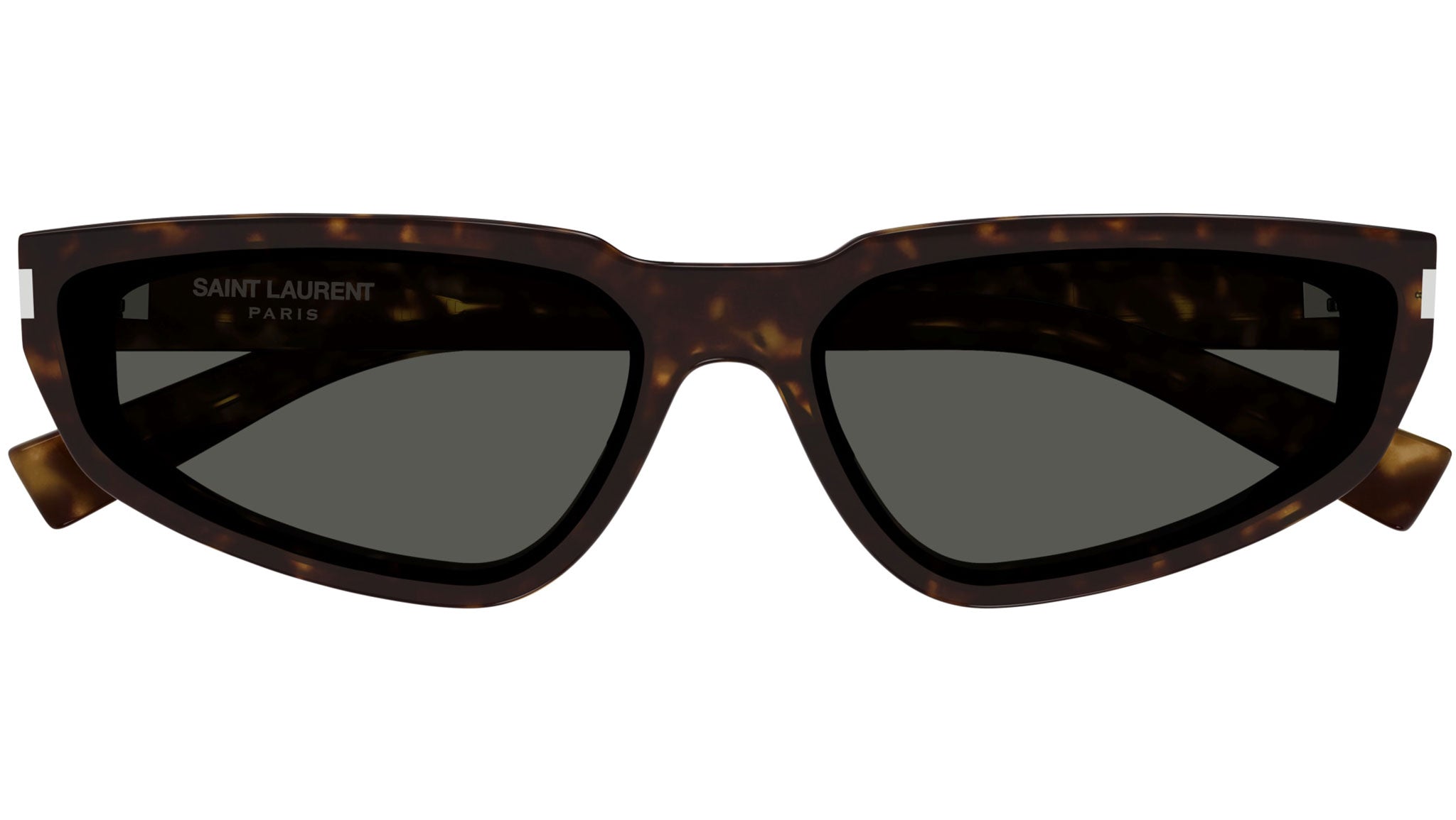 Occhiali da sole Saint Laurent modello SL 634 NOVA linea New Wave codice colore 002 tartaruga scuro lucido in acetato riciclato forma cat eye con lenti color grigio tinta unita.