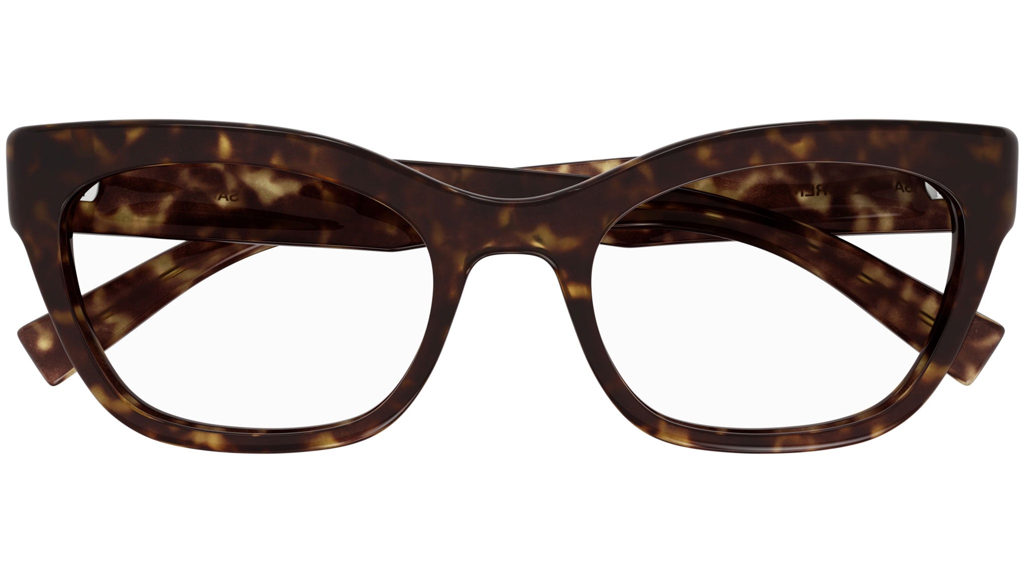 Occhiali da vista Saint Laurent modello SL 643 linea Classic codice colore 002 tartaruga scuro lucido in acetato riciclato forma cat eye con aste color tartaruga.